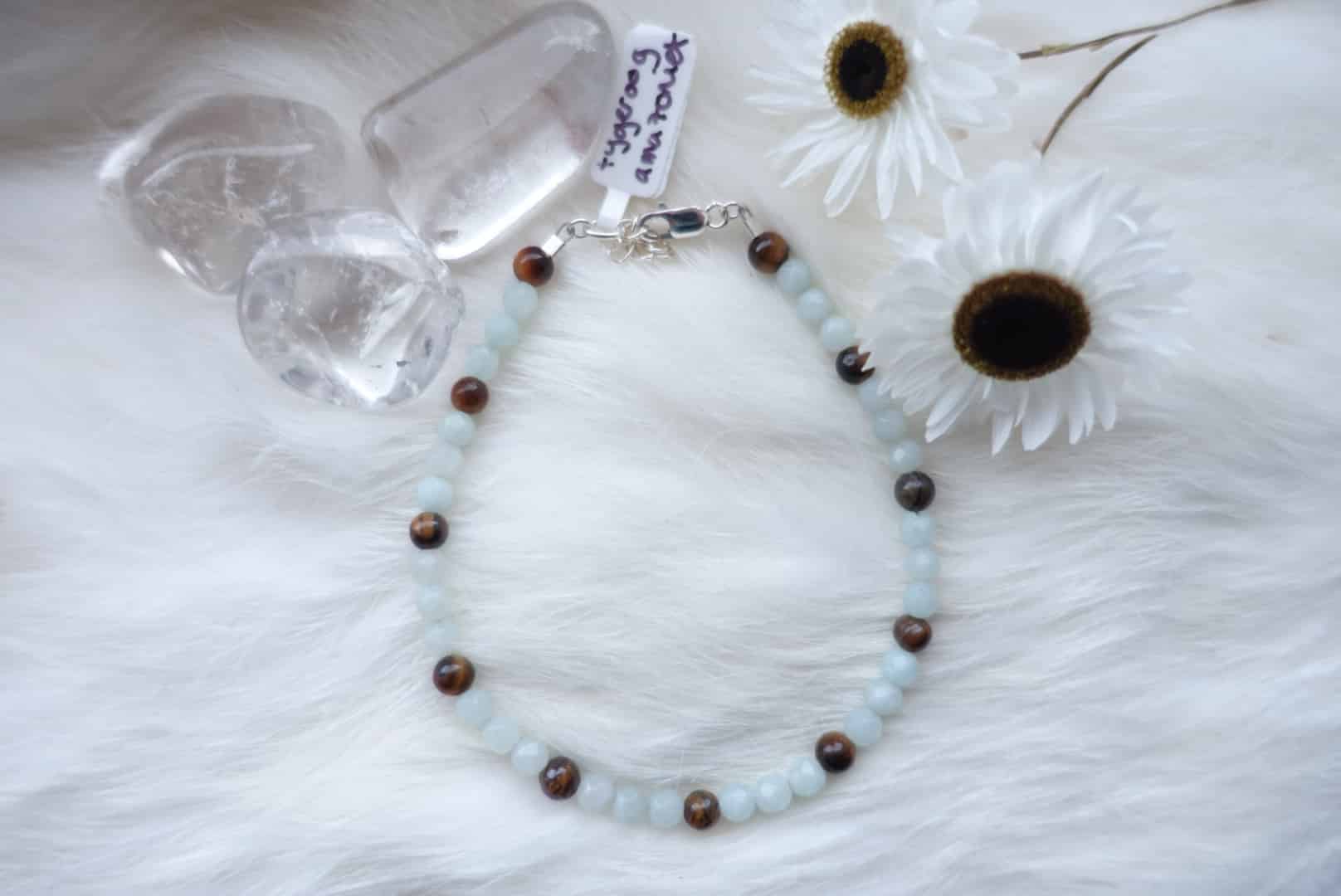 Armband met Amazoniet en Tijgeroog, afgewerkt met een 925 zilveren slotje slotje