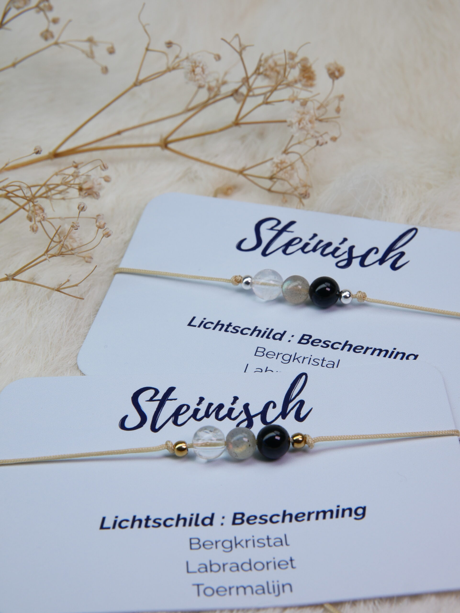 Voor wie wat bescherming kan gebruiken: een subtiel, krachtig schild. Bergkristal, Labradoriet en Toermalijn, zuiveren, versterken, beschermen je energie en helpen los te laten wat niet van jou is.
